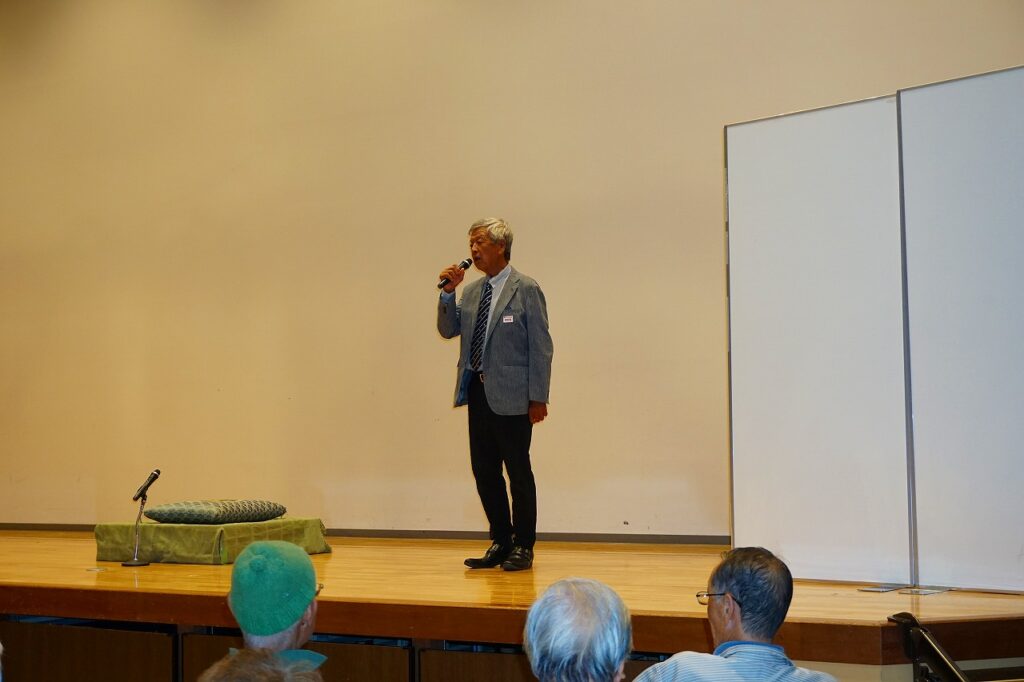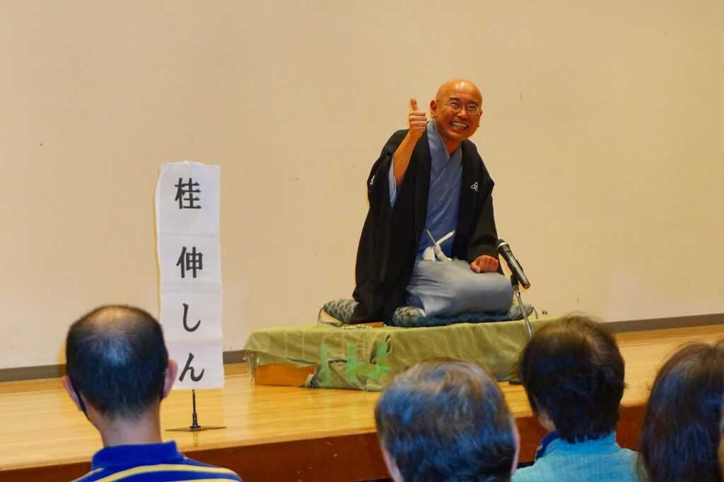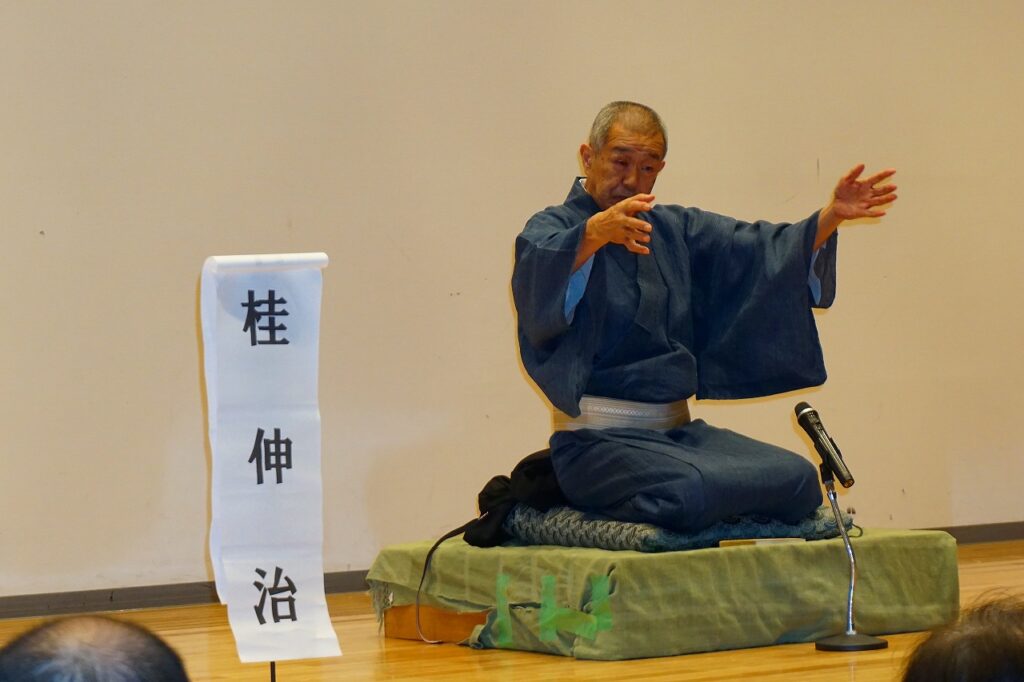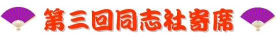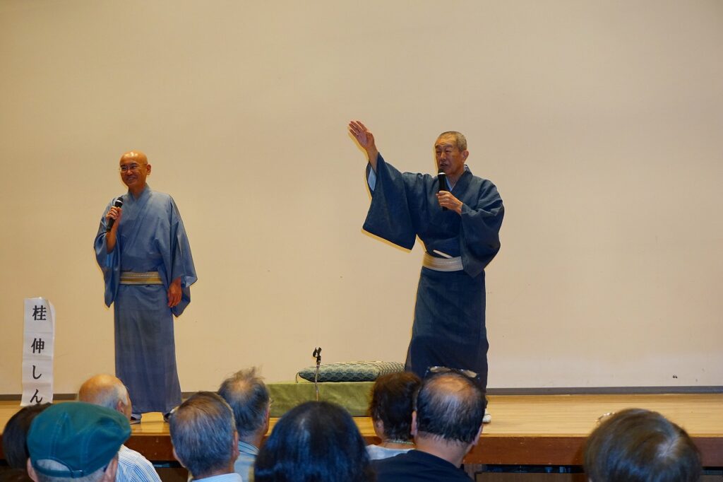 第3回 同志社寄席が9月27日、静岡市の中心地にある「コミュニティーホール七間町MIRAIE」で開催されました。お彼岸も過ぎたこの日、猛暑からは、朝晩はやや涼しくなったとはいえ、夏日に近い暑さの中、一般客を含め100名以上のお客さんがお見えになり盛大に開催されました。出演者は昨年同様、桂一門を率いる、「桂伸治師匠」とお弟子さんの「桂伸しん」さん。 出し物は伸治師匠が「粗忽の釘」と「鰻のたいこ」、伸しんさんは「真田小僧」と「熊の皮」。師匠の出し物は地方ではほとんど演じない出し物で、新宿末広亭の雰囲気を静岡で演じていただき、最後に師匠の「ネーム入り手ぬぐい」と昭和四十年代に末広亭や浅草演芸場に張られた「落語開催のポスター」をじゃんけんで勝ったお客さんにプレゼント、もらったお客さんは大喜び、皆本場の落語に大満足し、笑いで脳もだいぶ活性化され帰っていかれました。その後、2階で懇親会が開かれ、落語家のお二人も参加され、「話は苦手」と師匠が自己紹介をされ、笑いを誘い、落語談議に2時間、約20人のメンバーも天婦羅、お寿司を食べながら、お二人の話術にほろ酔い気分で本当に楽しい時間を過ごし、実のある懇親会でした。お二人も来年の再会を期して東京にお帰りになりました。